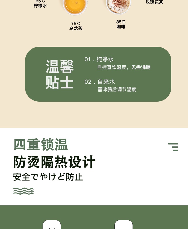 2-5分钟智能烧水不用等;六段温控满足各种需求;四重锁温防烫隔热设计;(现货调仓)