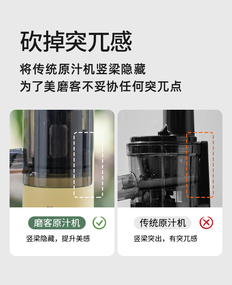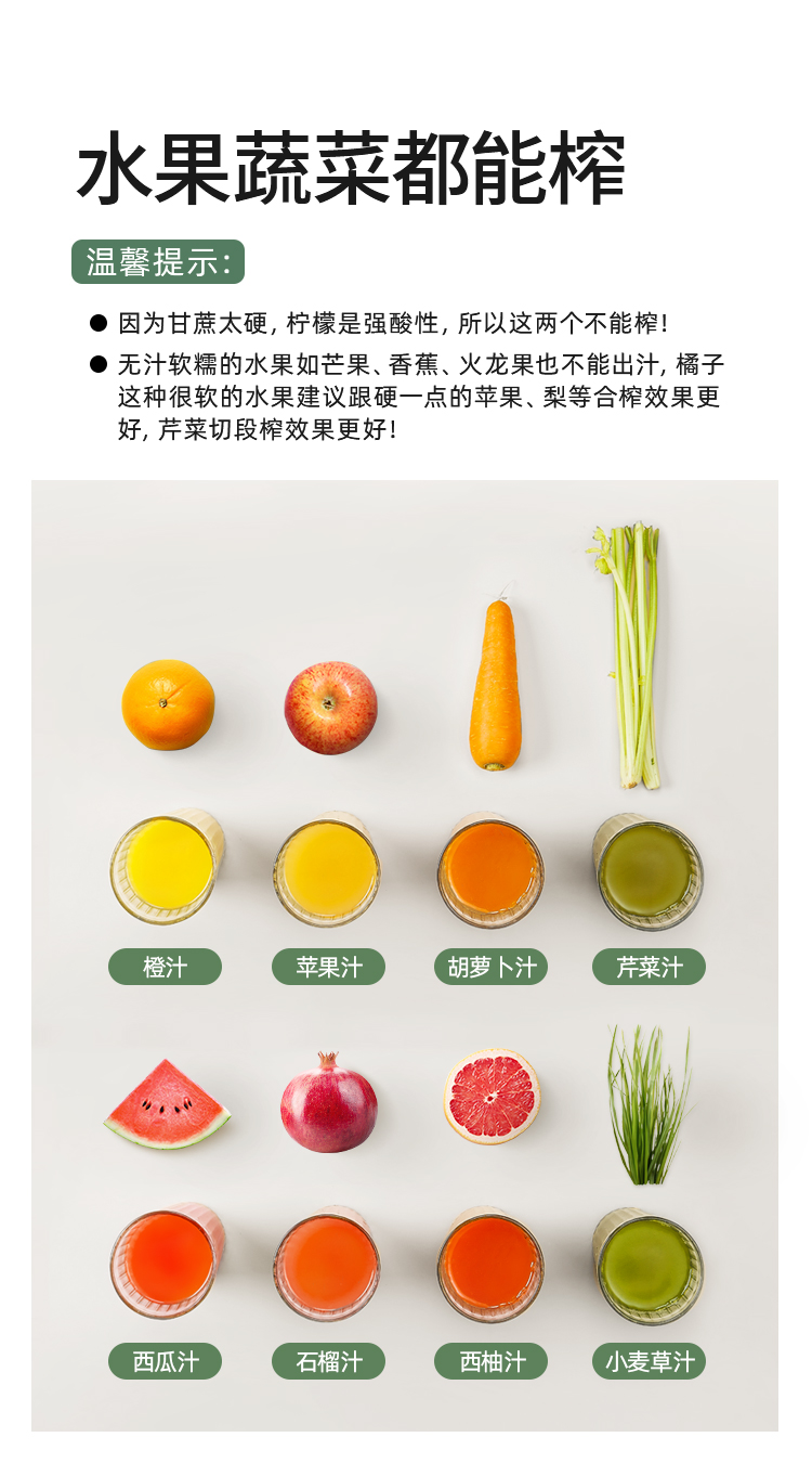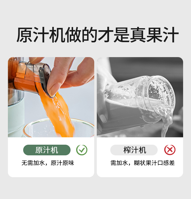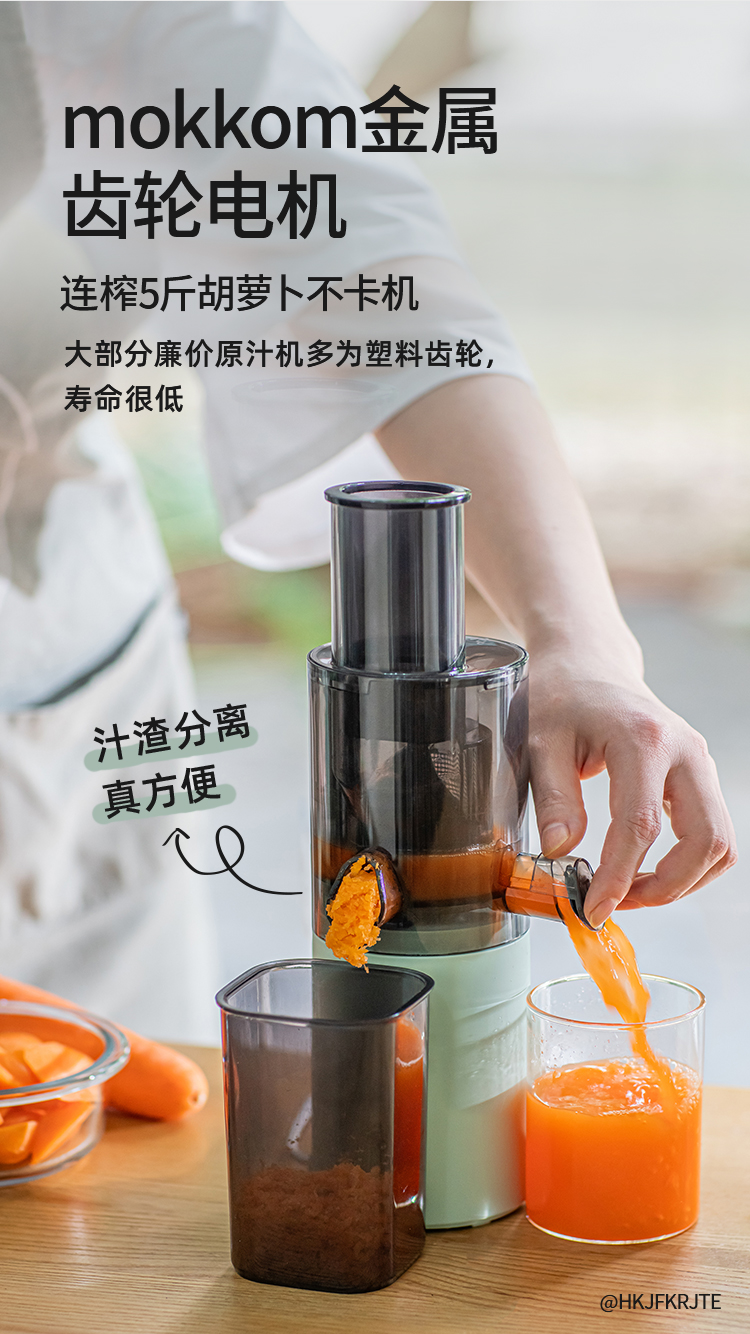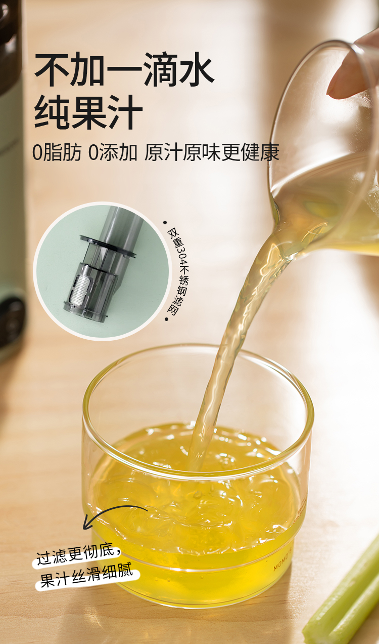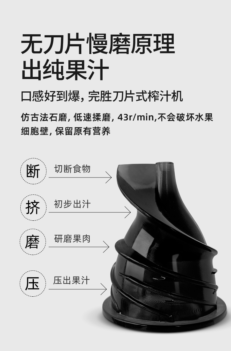 仿古法研磨,低速揉磨,不会破坏水果细胞壁;金属齿轮电机,汁渣分离;