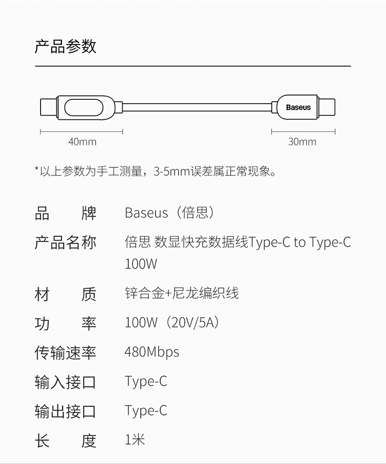 倍思 数显快充数据线Type-C to Type-C 100W 1m 华为笔记本平板手机快充线