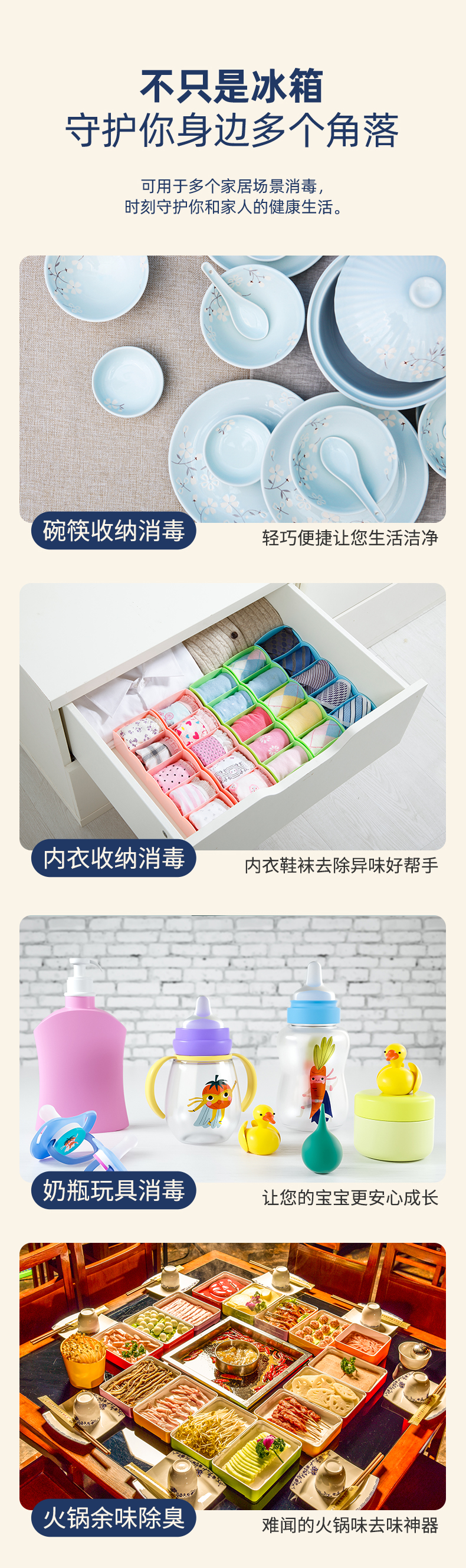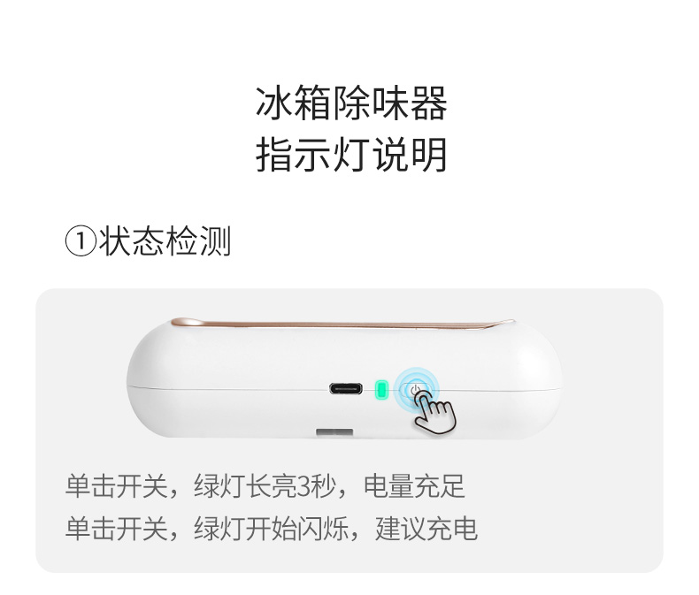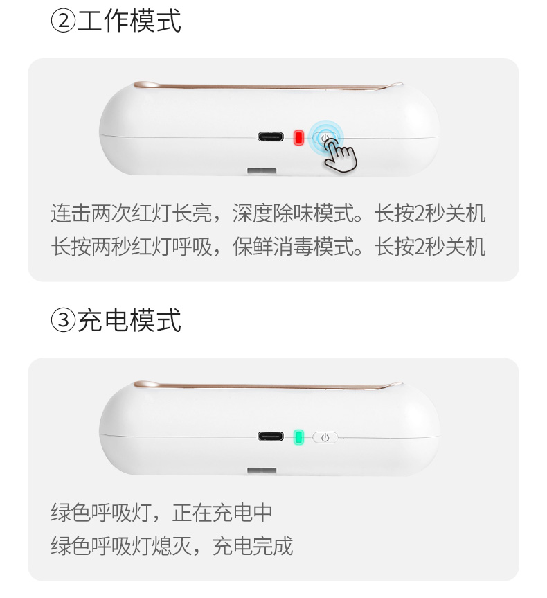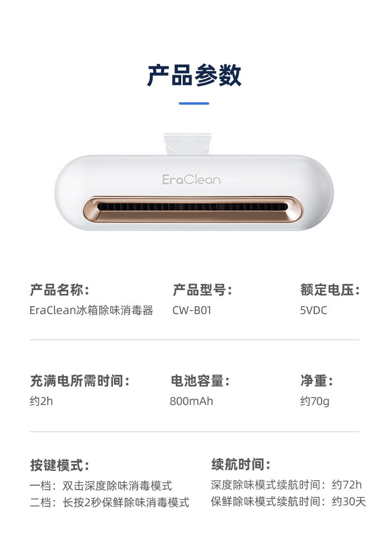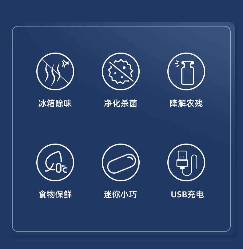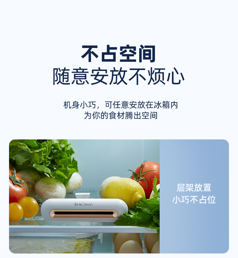 迷你小巧,不占空间 USB便携充电 卡扣设计 科学净味 空间循环消毒 食品保鲜 30天续航