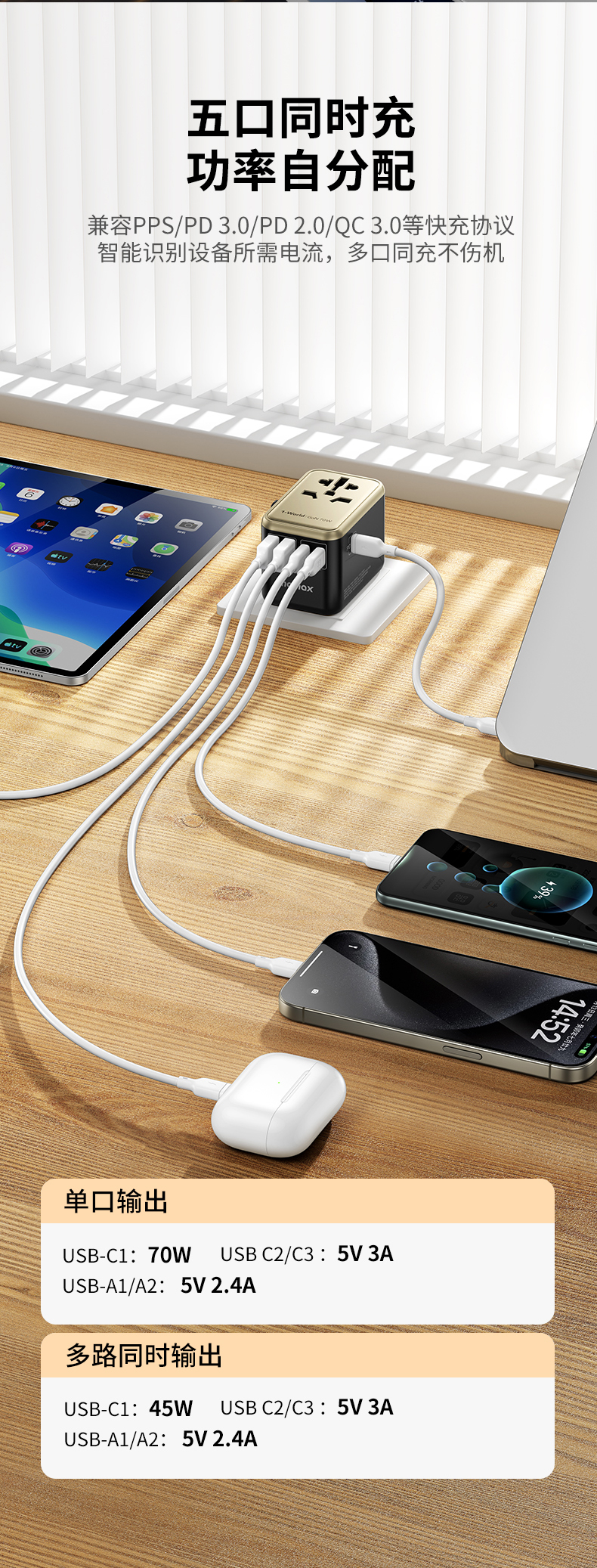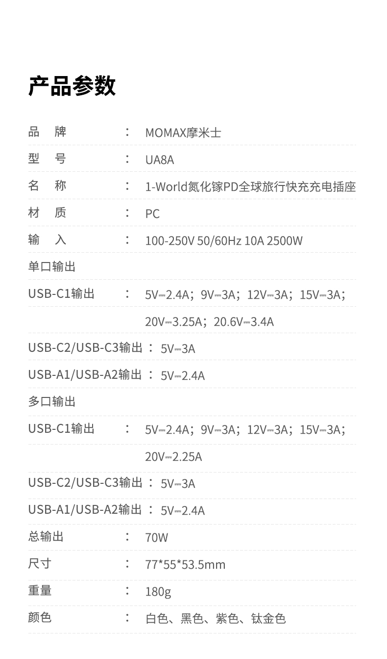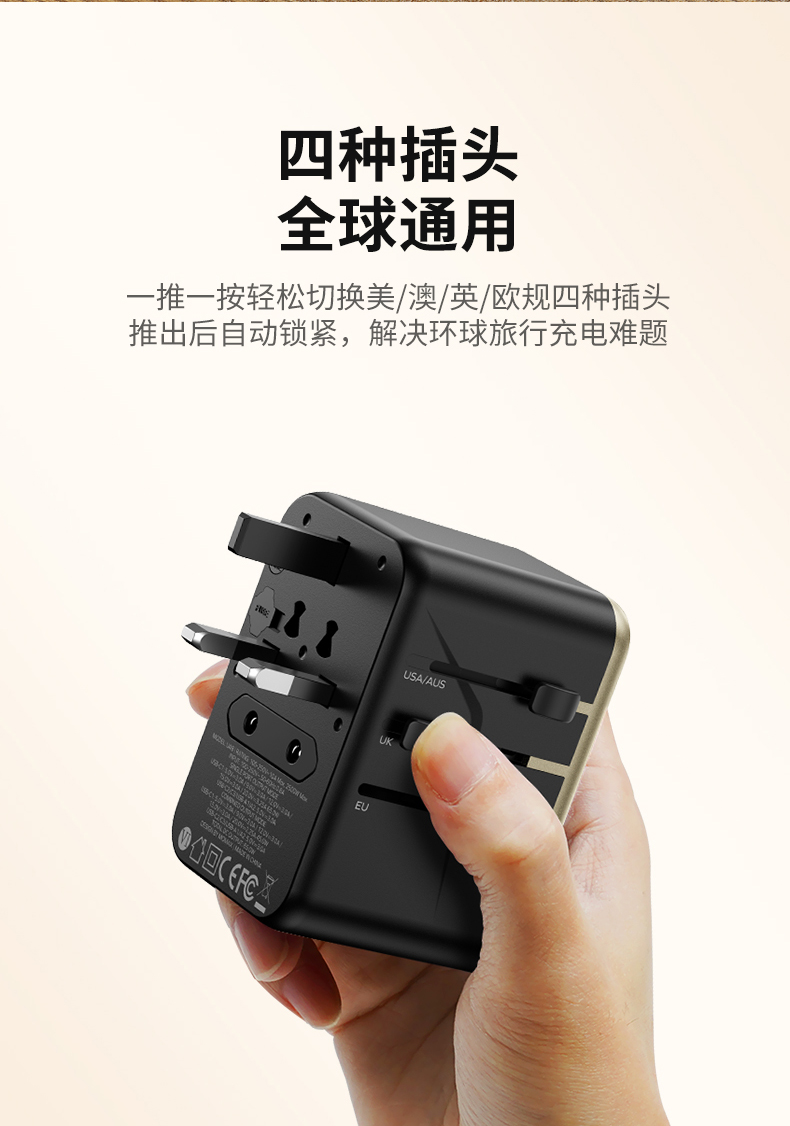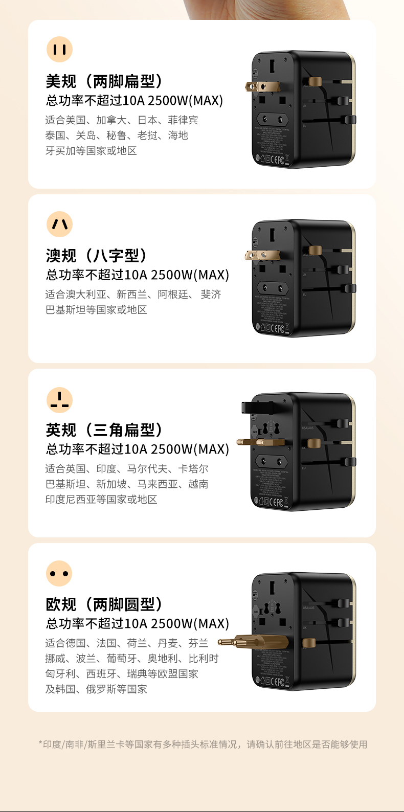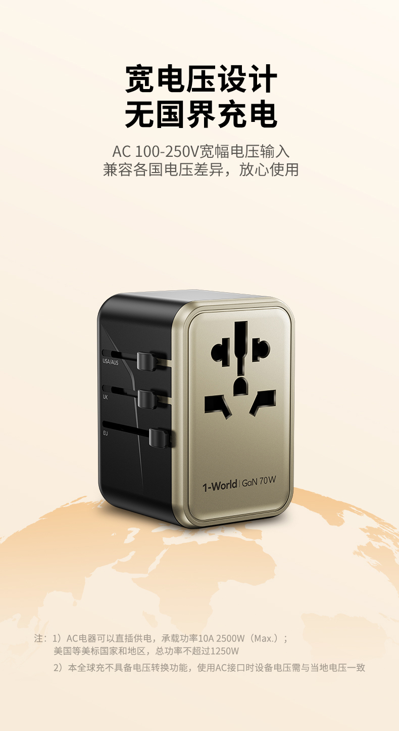 AC100-250V宽电压;出国旅行/出差/留学必备;英/美/德/澳/欧,224个国家通过用