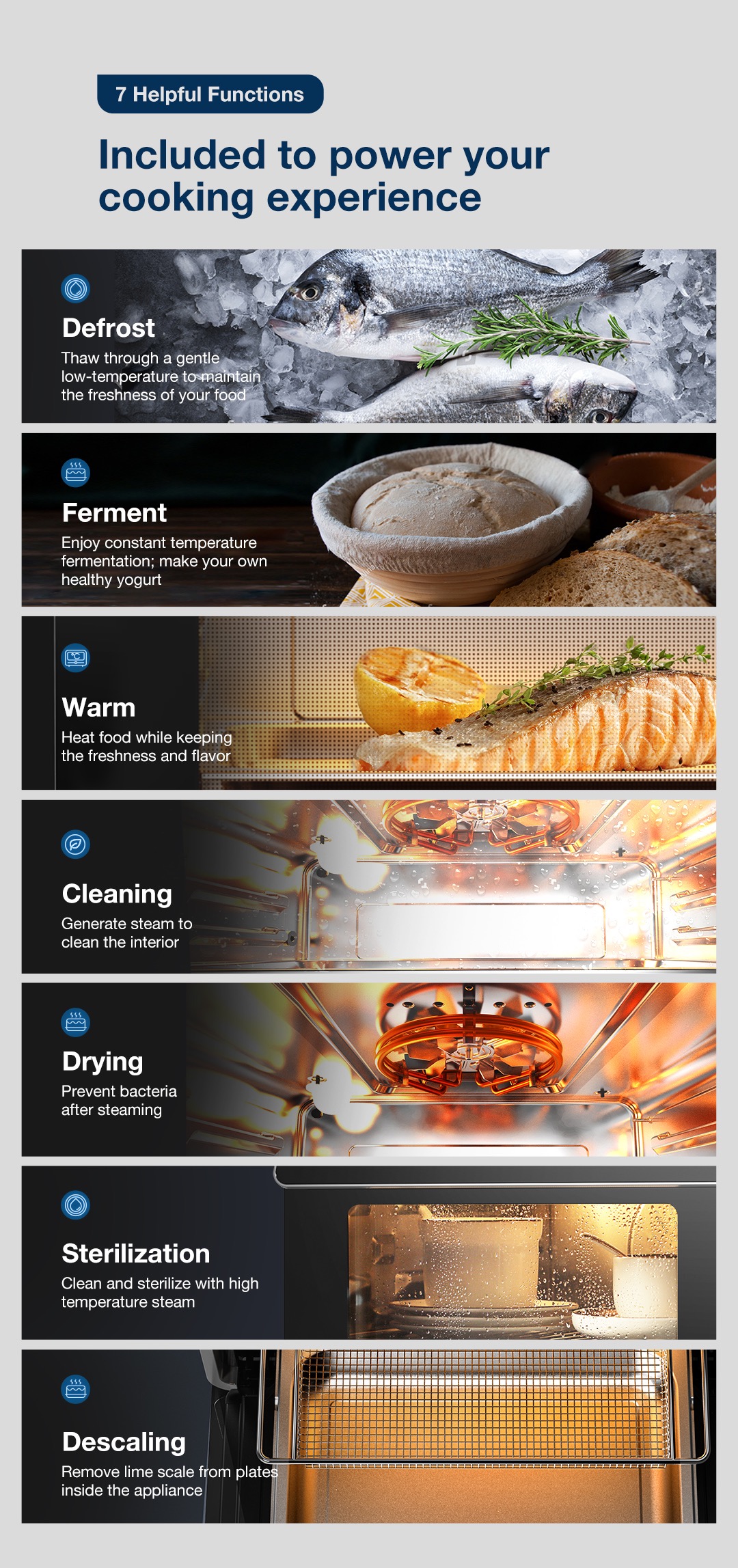 ● 7 helpful functions:Defrost,Ferment,Warm,Cleaning,Drying, Sterilization,Descaling