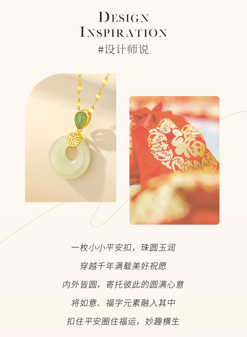 穿越前年满载美好祝愿;内外皆圆,寄托彼此圆满心意;将如意和福字嵌入其中,扣住平安,圈住幸福