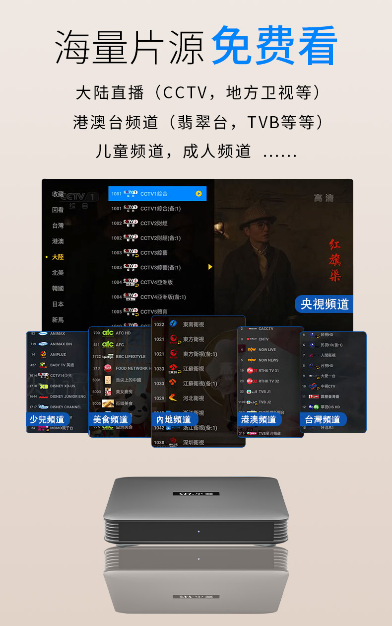 永久免费看大陆港澳台直播成人频道儿童频道及海量片源 超大内存不卡顿 最高8K超清画质 蓝牙语音遥控 永远免费OTA升级 盒子开机设置完成进入主页后,Cherry TV-成人,Yogurt Kid-儿童,Yogurt TV-直播和点播,阖家欢-K歌APP,用遥控器数字键按6868-安装APP, 按898989-安装成人频道(密码:898989)(请注意该电视盒子只限在澳洲使用,别的地区会造成永久锁死或锁机)