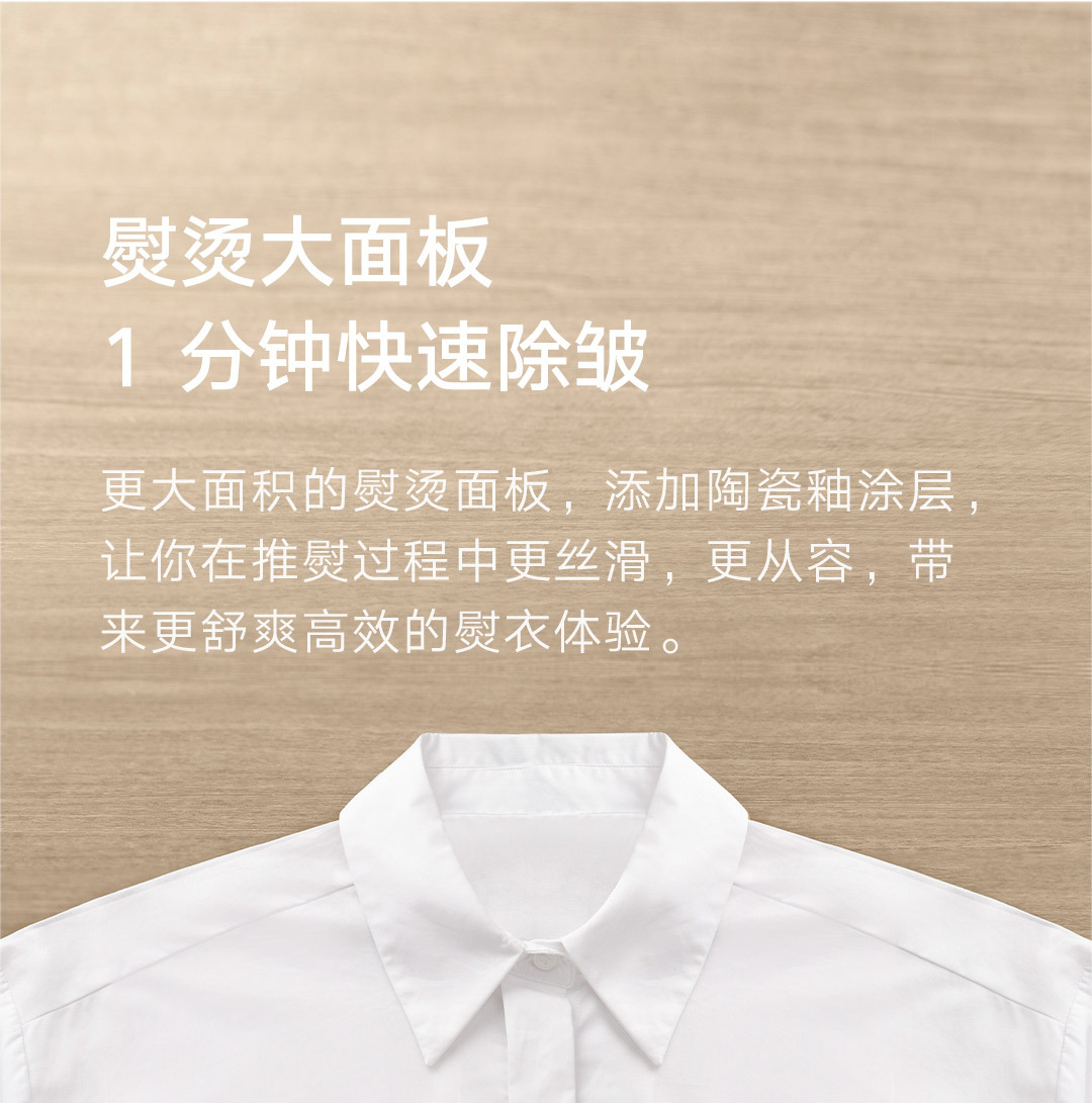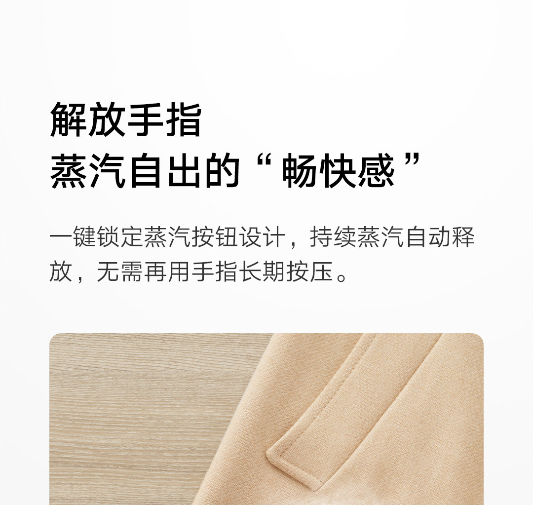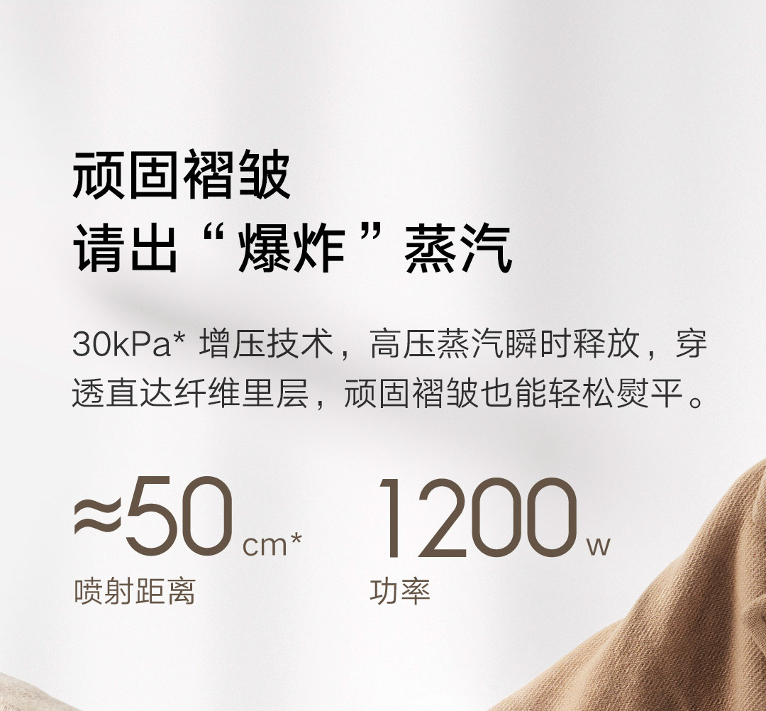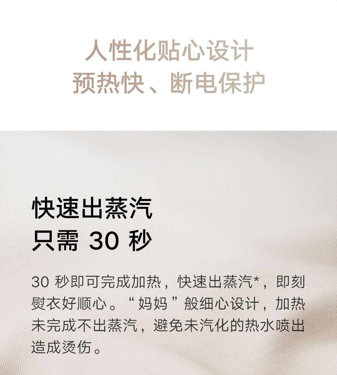 30秒快速出蒸汽;1分钟快速除皱;可视化150ML大水箱; 增压脉冲蒸汽;高温蒸汽除菌除螨,多种熨烫模式;