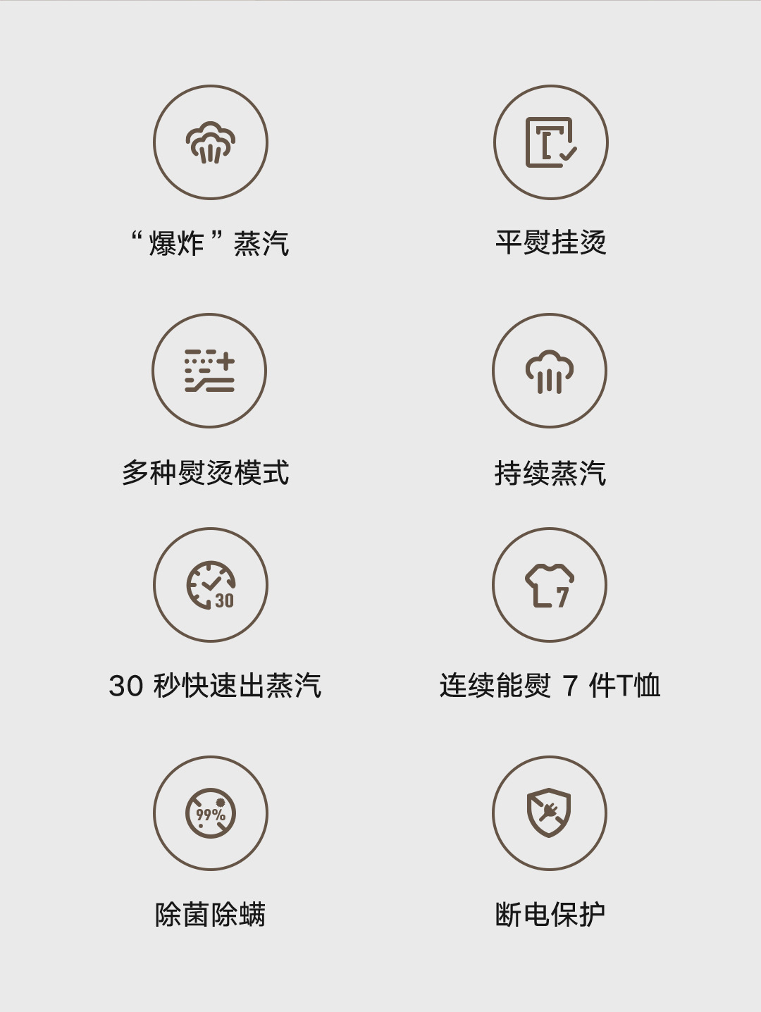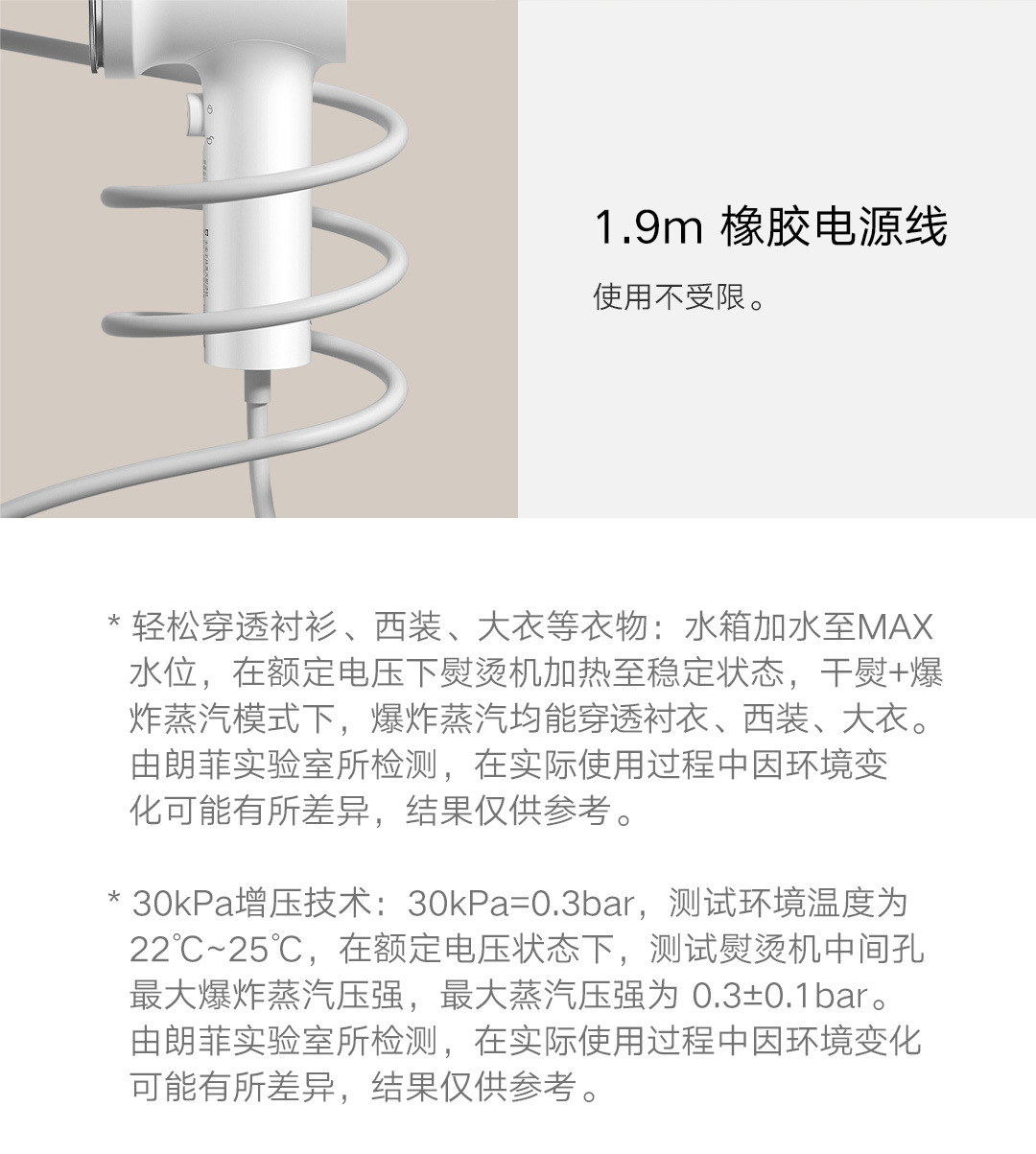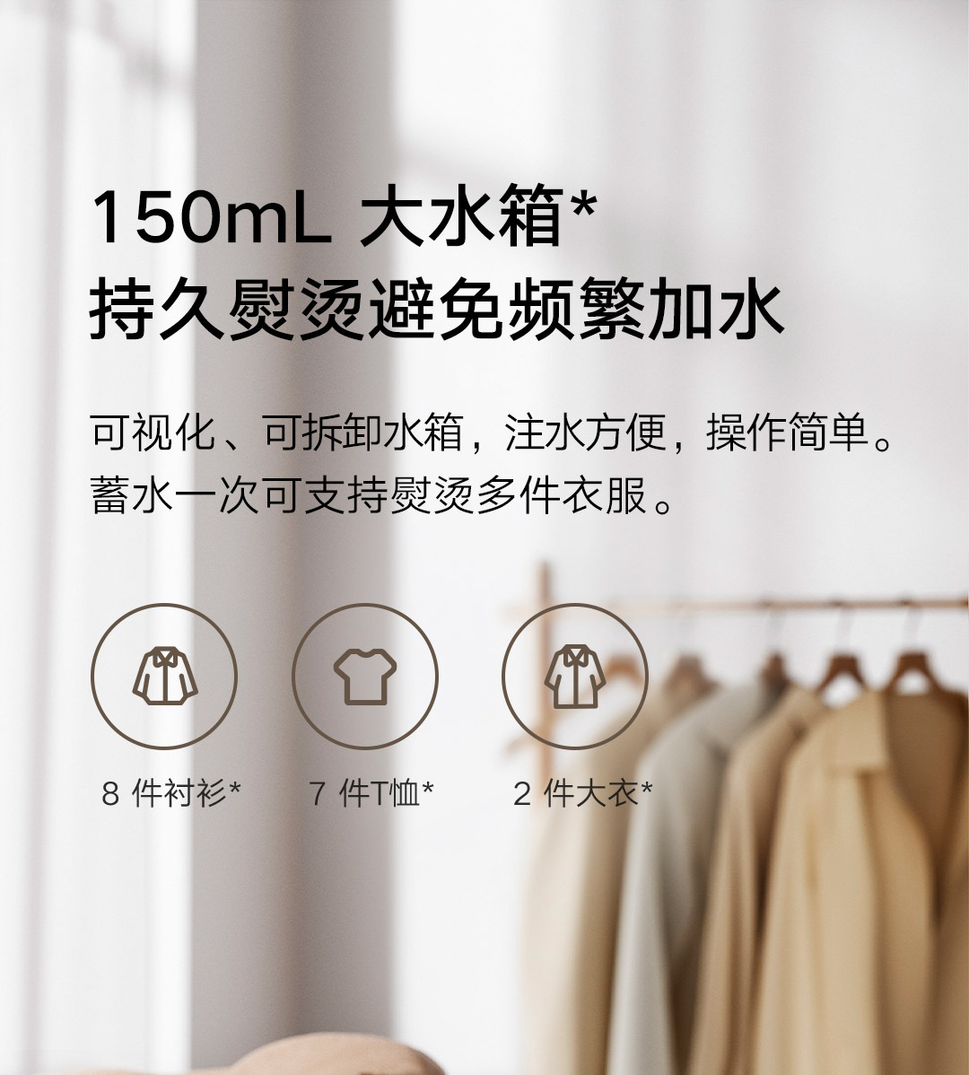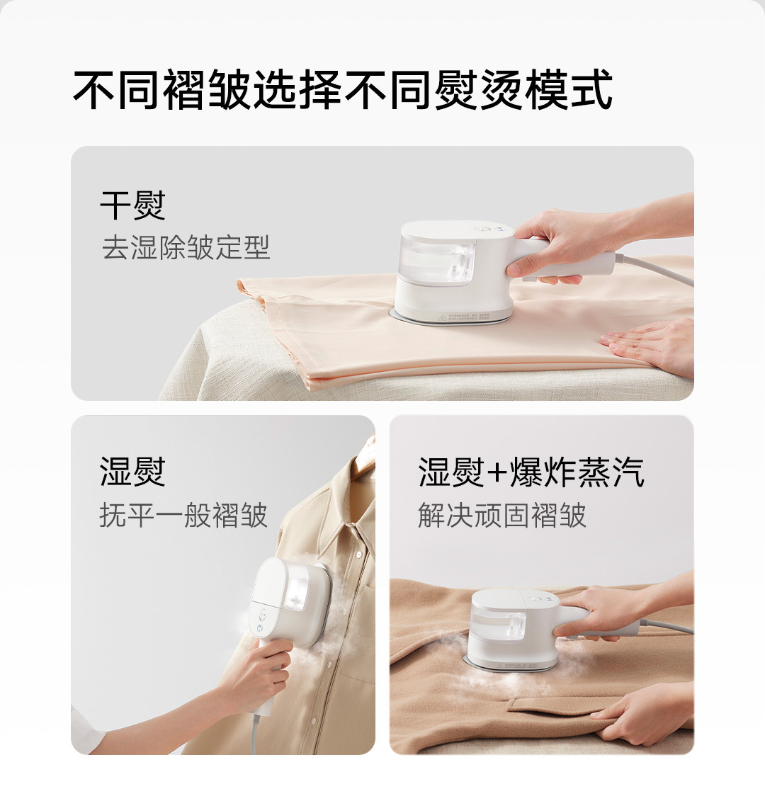30秒快速出蒸汽;1分钟快速除皱;可视化150ML大水箱; 增压脉冲蒸汽;高温蒸汽除菌除螨,多种熨烫模式;