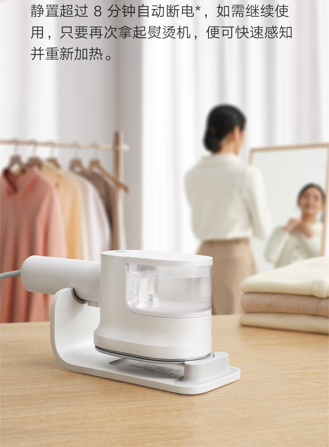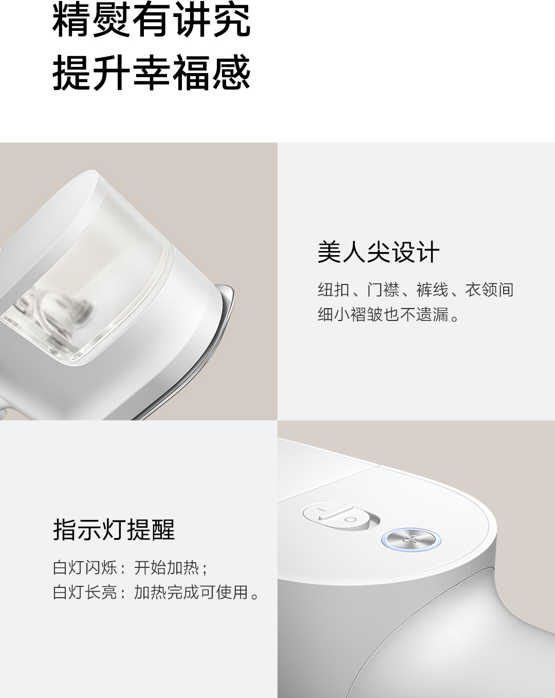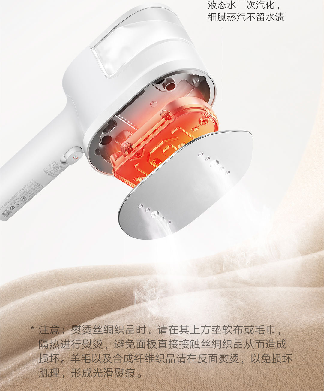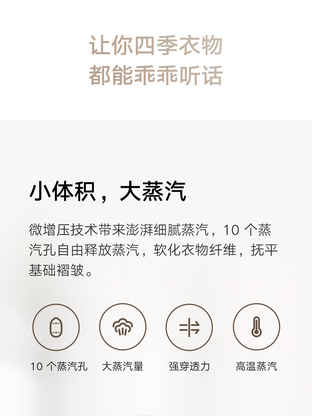 30秒快速出蒸汽;1分钟快速除皱;可视化150ML大水箱; 增压脉冲蒸汽;高温蒸汽除菌除螨,多种熨烫模式;